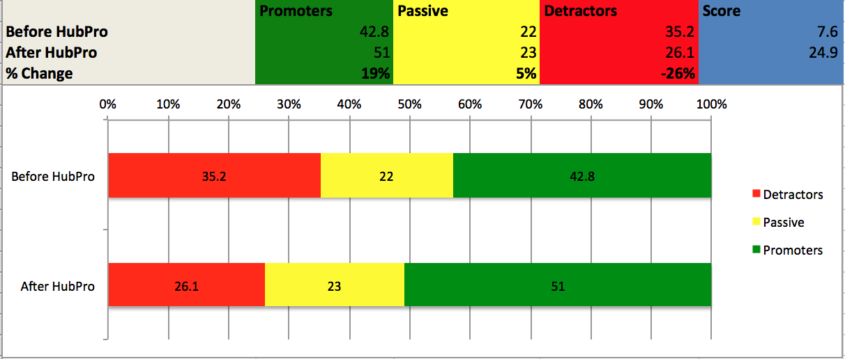 Displayed above is a chart that shows the reader satisfaction for HubPro Hubs before and after editing. We measure reader satisfaction with a metric similar to NPS (or Net Promoter Score). We ask readers to rate the Hub from 1-10 based on their level of satisfaction. The NPS is found by subtracting the percent Detractors (people who rated the Hub a 6 or less, shown above in red) from the percent Promoters (people who rated the Hub a 9 or 10, shown above in green). As you can see, edited Hubs have about the same number of Passives (people who rated the Hub a 7 or 8, shown above in yellow), but significantly more Promoters and significantly less Detractors, meaning more readers are satisfied with the Hub in general, and less are having a bad experience. Moving the score from 8 to 25 is a huge improvement!